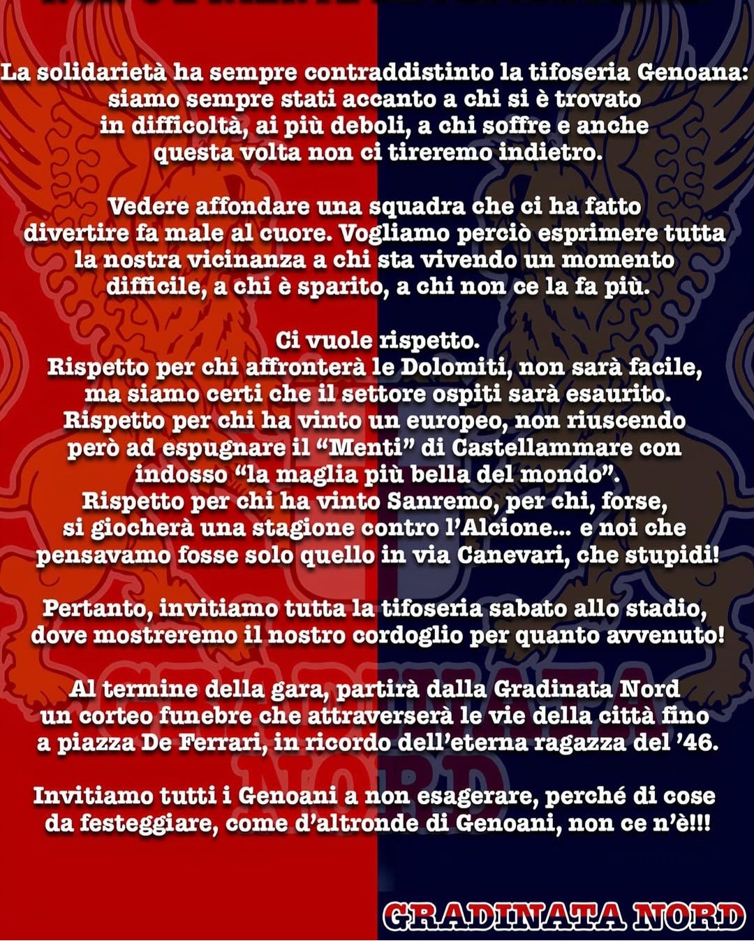 Questo rappresentano questi colori ed il Grifone e tutto ció è sempre andato al di là dei risultati sportivi della squadra, per quanto anch’essi abbiano comunque forte importanza per ogni genoano.